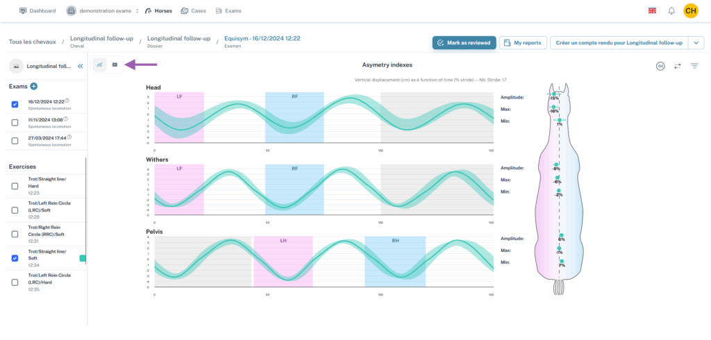 Find the exam for which you wish to download the videos by going to the exams tab or by going to the horses tab and then exams on the horse page. Once you are on the exam data screen, select the condition you are interested in and click on the video logo at the top left of the data.