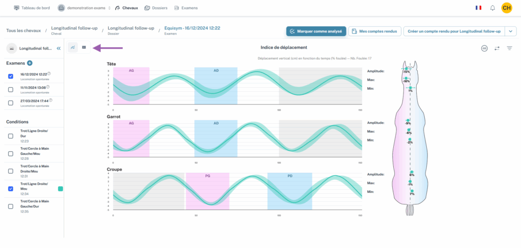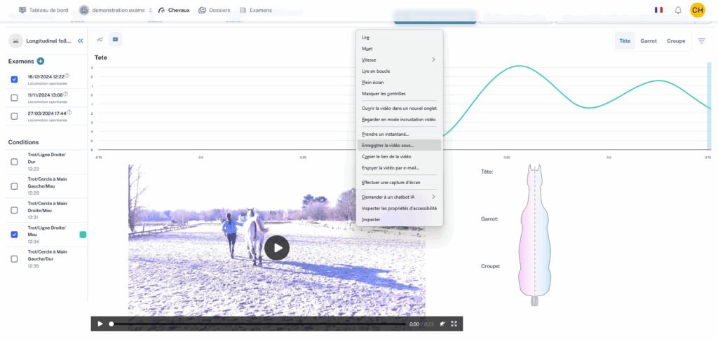 Trouvez l’examen pour lequel vous souhaitez télécharger les vidéos en allant dans l’onglet examens ou en passant par l’onglet chevaux puis examens dans la page cheval. Une fois sur le visuel des datas de l’examen, sélectionnez la condition qui vous intéresse et cliquez sur le logo vidéo en haut à gauche des datas.