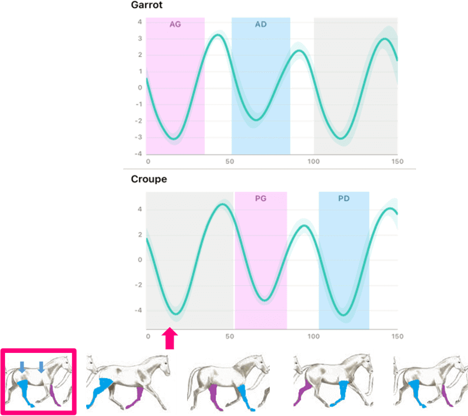 Graphiquement, ces durées d’appuis sont visibles par les zones roses et bleues respectivement membre gauche et droit. Le début d’une zone marque le début de l’appui du membre concerné, le pied est à plat. La fin de la zone marque la fin de l’appui avec le décollement du talon. Entre les deux : le minimum correspond au point le plus bas du garrot et de la croupe, proche de la descente maximale des boulets et donc, du milieu de la phase d’appui.